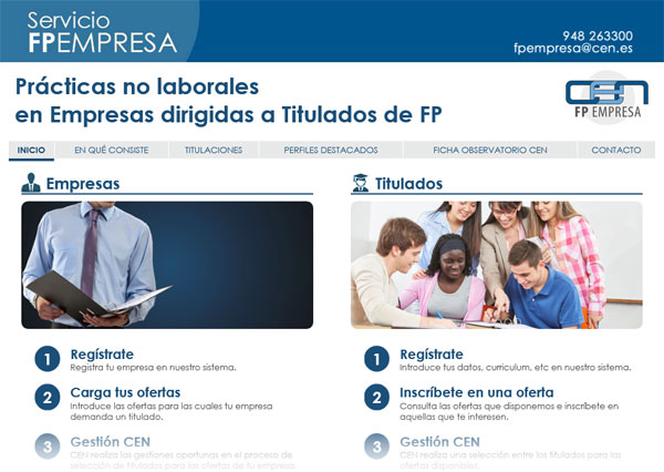 La Confederación de Empresarios de Navarra (CEN) pone a disposición de las empresas de la Comunidad Foral su servicio "FP Empresa", de gestión de prácticas no laborales dirigidas a jóvenes desempleados titulados en FP. Se trata de una iniciativa de FP dual, que beneficia, tanto a los alumnos que deseen iniciarse en el mercado de trabajo, como a las empresas, que tendrán oportunidad de contribuir a la formación y desarrollo profesional de titulados de FP, pudiendo optar incluso a su contratación laboral.