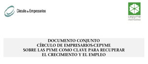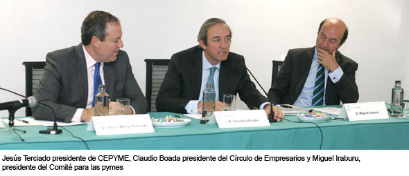 La semana pasada el Círculo de Empresarios y CEPYME presentaron un documento conjunto centrado en las Pymes como clave para recuperar el crecimiento y el empleo. Participaron en el acto Claudio Boada, presidente del Círculo de Empresarios, Jesús Terciado, presidente de la Confederación Española de la Pequeña y Mediana  Empresa (CEPYME) y Miguel Iraburu, presidente del Comité para las pymes.