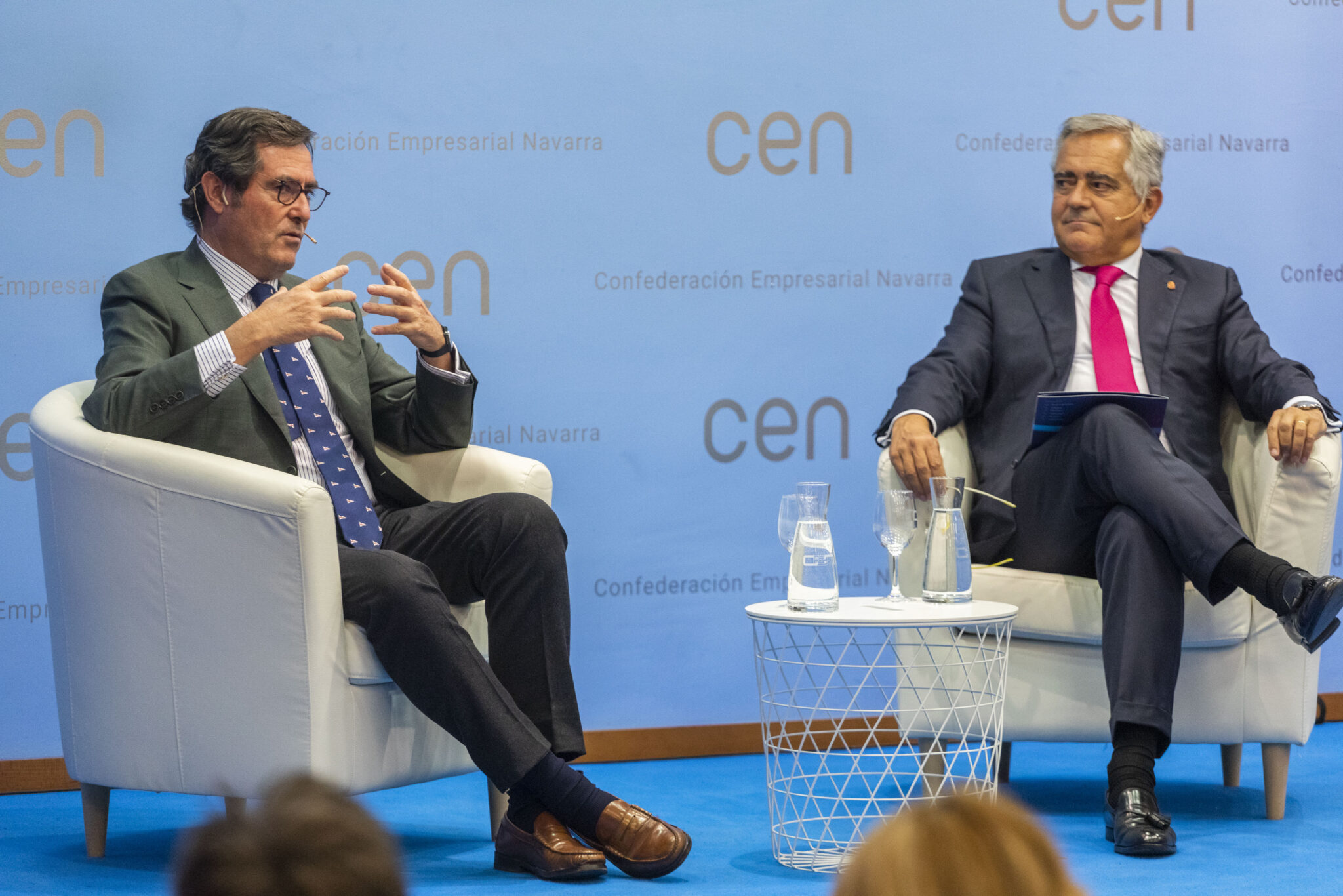 Bajo el título de "Las empresas ante los nuevos retos de 2023" el presidente de CEN, Juan Miguel Sucunza, y el presidente de CEOE, Antonio Garamendi, protagonizaron un encuentro empresarial ante más de 120 empresarios y empresas reunidos en la Confederación Empresarial Navarra, en la que abordaron, entre otros aspectos, temas de gran actualidad relacionados con la industria, los fondos europeos, el diálogo social, la fiscalidad y las perspectivas económicas.