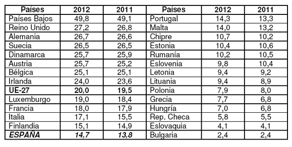 Levemente por debajo del promedio se sitúan Luxemburgo (19,0%) y Francia (18,0%). Italia alcanza un 17,1% y Finlandia un 15,1%. En España el trabajo a tiempo parcial sigue aumentando aunque lentamente. En 2012 hemos podido avanzar a un 14,7%, pero aún seguimos lejos de la media europea. Portugal y Malta también están por encima del 14%, mientras que las cifras ya bajan al entorno del 10% en Chipre, Estonia, Rumanía y Eslovenia. Los países con menor proporción de trabajadores a tiempo parcial son la República Checa (5,8%), Eslovaquia (4,1%) y Bulgaria (2,4%).