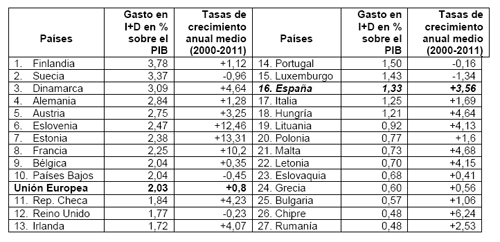 Por debajo del promedio, aunque con cifras todavía cercanas están la República Checa, el Reino Unido e Irlanda. Por lo que respecta a España el Informe de la Comisión Europea sobre “Investigación e Innovación en los Estados Miembros de la UE” recalca que el aumento del gasto español en I+D ha estado encima de la media entre 2000 y 2009, pero se ha reducido a partir de ahí con una caída muy acusada en los Presupuestos Generales para 2012. El gasto en I+D de España alcanza un 1,33% sobre el PIB en 2011. Con ello ocupamos el puesto 16 en la UE. Por ello la Comisión Europea afirma que “los niveles de inversión en I+D son todavía bajos, la excelencia en ciencia y tecnología se sitúa por debajo de la media europea y hay que fortalecer el crecimiento de empresas innovadoras”. Por detrás de España aparecen Italia y Grecia entre los países de la antigua UE-15, así como el grueso de los estados miembros de reciente adhesión.