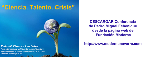 Pedro Miguel Echenique, Catedrático en Física y Premio Príncipe de Viana defendió en el tercer foro internacional del Talento (Ágora Talentia), la necesidad de crear unos pilares sólidos en la ciencia, en el talento y en la educación que sirvan para desenvolverse en un mundo en el que la incertidumbre cada vez es mayor y que no permitirá que vuelvan tiempos pasados. La Fundación Moderna es la encargada de organizar esta convocatoria de carácter bianual. El evento también lo coorganiza la Unión Europea, a través del Programa Brain Flow Interreg IVC, y, entre otras entidades, cuenta con la colaboración del Gobierno de Navarra, la Confederación de Empresarios de Navarra y el Servicio Navarro de Empleo.