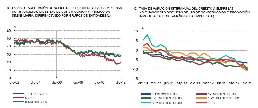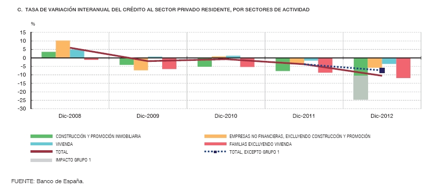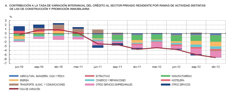 Según esta información, el volumen de préstamos destinados a familias y empresas descendió en casi 139.000 millones de euros en 2012, un caída del 5,6% interanual, hasta los 2,34 billones de euros. Así, el peso relativo del crédito privado en los balances bancarios bajó del 63,9% en 2011 al 60,7% en diciembre del año pasado.