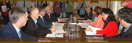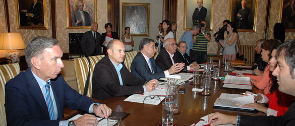 1- Proceder a la constitución formal de la Mesa con la participación de las máximas autoridades de la Comunidad Foral y los máximos representantes de las organizaciones empresariales y sindicales: la presidenta del Gobierno de Navarra, Yolanda Barcina, la consejera de Economía, Hacienda, Industria y Empleo, Lourdes Goicoechea, el presidente de la Confederación de Empresarios de Navarra, José Antonio Sarría, el secretario general de la Unión General de Trabajadores, Juan Goyen, y el secretario general de CCOO de Navarra, Raúl Villar. A ellos les acompañan asesores de cada organización.