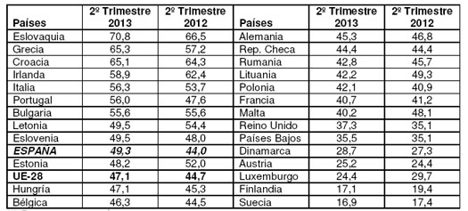 En Eslovaquia el paro de larga duración ya supera el 70%, mientras que Grecia y Croacia están por encima del 65% e Irlanda roza el 60%. Italia registra un 56,3% y Portugal un 56,0%. Bulgaria se sitúa en 55,6%. Letonia y Eslovenia comparten un 49,5%. España se acerca al 50% con una tasa de paro de larga duración del 49,3%, lo que equivale a una subida de más de cinco puntos porcentuales desde el segundo trimestre de 2012. Estonia también supera el promedio de la UE-28 con una cifra del 48,2%, mientras que Hungría se queda justo en la media.