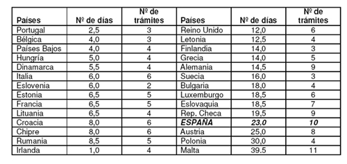 Portugal es el país que ofrece las mejores condiciones con 2,5 días para abrir una empresa y sólo 3 trámites. Bélgica y los Países Bajos figuran a continuación con 4 días y Hungría ocupa el cuarto lugar con 5 días. En Dinamarca se tarda 5,5 días, mientras que en Italia y Eslovenia llegan a 6. En Estonia, Francia y Lituania el tiempo requerido aumenta levemente a 6,5 y los trámites se mueven entre 4 y 5. Croacia, Chipre y Rumanía se sitúan en torno a 8 días, mientras que en Irlanda estamos en diez días y 4 trámites. En el Reino Unido se tarda 12 días, 14 días en Finlandia y en Grecia. En Alemania hacen falta 14,5 días y muchos trámites. España figura en los últimos puestos del ranking. Aunque el número de días que se tarda en abrir una empresa en España se ha reducido de 28 a 23 días, los trámites siguen siendo 10, una cifra entre las más elevadas de la Unión Europea. Sólo quedan tres países por detrás de nosotros: Austria con 26 días, Polonia con 30 días y Malta con 39,5 días y 11 trámites.
