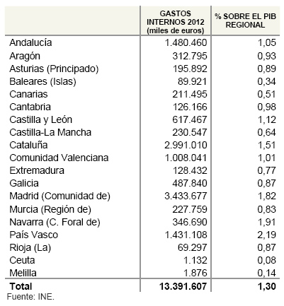 Las comunidades autónomas que realizaron un mayor esfuerzo en actividades de I+D en el año 2012 fueron, en primer lugar, País Vasco (2,19% del PIB), Navarra (1,91% del PIB), Comunidad de Madrid (1,82%) y Cataluña (1,51%). Siendo éstas las únicas comunidades que presentan cifras de intensidad en el gasto de I+D superiores a la media nacional.