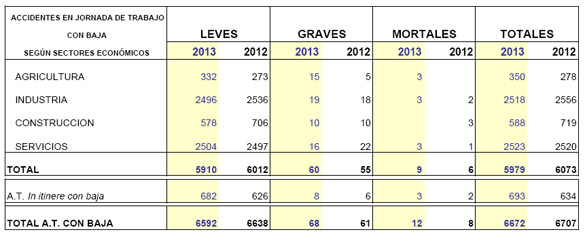De los 5.979 accidentes en jornada de trabajo con baja se registraron 60 graves (5 más que en 2012) y 9 mortales (3 más que en el mismo período anterior).