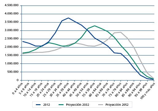 Si se mantienen estas tendencias demográficas, en el año 2052, la población comprendida entre los 0 y los 24 años de edad se reduciría en casi tres millones. No obstante, la pérdida de población más significativa se encontraría entre el grupo de edad de los 25 a los 65 años, precisamente en el que se encuentra en edad de trabajar, el cual podría llegar a reducirse en casi nueve millones de personas. En este contexto, el único grupo de edad que crecería es el mayor de 65 años, con un aumento de más de siete millones. Cabe destacar que el efecto del baby boom, que tuvo lugar en España entre los años 50 y los 70, conllevará la jubilación masiva de una generación.