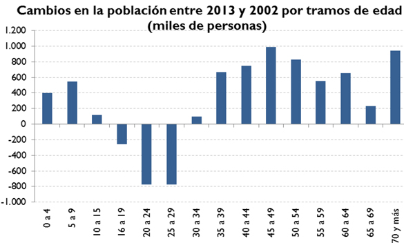 Por otra parte, el documento también muestra cómo, a pesar del descenso en el último año, entre 2002 y 2013, la población en España aumentó en casi cinco millones de personas, si bien de manera muy desigual. En concreto, la población entre 16 y 30 años se redujo en 1,8 millones de personas, mientras que se produjo un notable incremento en las cohortes de más edad, casi un millón más entre las personas de 45 a 49 años y casi otro millón adicional entre las de 70 años y más. En conjunto, la población mayor de 35 años aumentó en 5,6 millones.