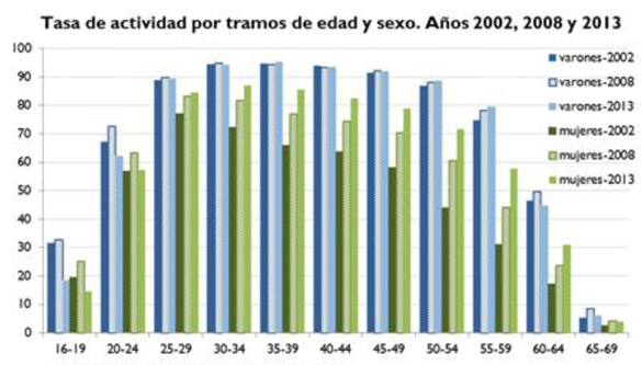 Por su parte, el siguiente tramo de edad, el comprendido entre 35 y 44 años, crece entre 2002 y 2012, pero se observa como invierte este comportamiento en dicho año y ya decrece en 2013. En cambio, los únicos tramos que ganan población durante todo el periodo son los de más edad, el de 45 a 54 años y el de 55 a 64 años. Es decir, el descenso de la población joven se va trasladando paulatinamente a otros grupos de edad a medida que va pasando el tiempo. A modo de ejemplo, que en 2002 la población entre 16 y 24 años era prácticamente igual a la población entre 45 y 54 años. Once años más tarde, hay cerca de 2,9 millones de personas más en el segundo grupo que en el primero.