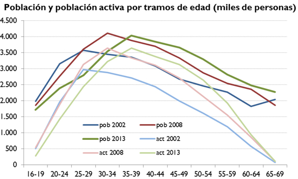 Conforme a los datos expuestos en el informe de CEOE, el envejecimiento de la población se hace más visible en la población en edad de trabajar (entre 16 y 64 años, principalmente). La población entre 16 y 24 años ha tenido una tendencia a la baja durante todo el periodo analizado, en el que se ha reducido en más de un millón de personas. Se observa también que la población entre 25 y 34 es creciente hasta 2008, y a partir de dicho año comienza un pronunciado descenso, perdiendo casi 1,4 millones de personas en los últimos cinco años.