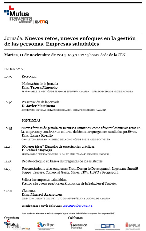 El próximo día 11 de noviembre, la sede de CEN acoge la jornada "Nuevos retos, nuevos enfoques en la gestión de las personas. Empresas saludables", organizada por Mutua Navarra y Aedipe, y que cuenta con la colaboración de Prevención Navarra, CEN y el Instituto de Salud Pública y Laboral de Navarra (ISPLN).