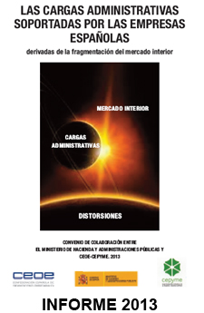 CEOE ha presentado recientemente su informe "Cargas administrativas derivadas de la fragmentación del mercado interior", complementario al documento presentado el año pasado también relativo a la reducción de cargas administrativas. El último informe, realizado en colaboración con CEPYME y el propio Ministerio de Hacienda y Administraciones Públicas, propone un total de 24 medidas para la eliminación de estas cargas, que supondrían un ahorro de más de 215 millones de euros anuales.