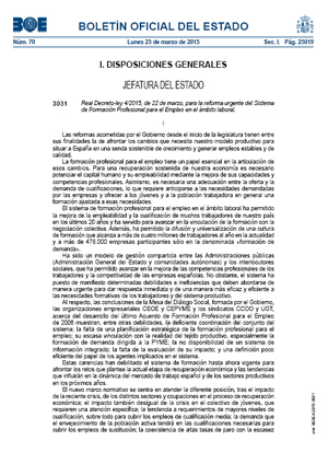 Finalmente, tras más de un año de negociaciones con empresarios y sindicatos, el Gobierno aprobó en solitario el Real Decreto-ley 4/2015, de reforma de la formación, por la que se deja a los agentes sociales al margen de la gestión e impartición directa de cursos, que pasan a concederse en concurrencia competitiva. Por tanto, "la reforma de la formación que ha aprobado el Consejo de Ministros representa una declaración de guerra en toda regla para muchos miembros de la CEOE y las centrales sindicales", señalaba este miércoles Antonio Maqueda, del portal VozPopuli.