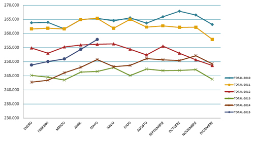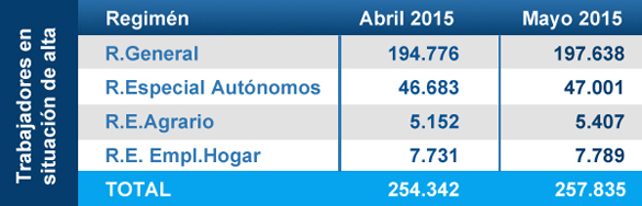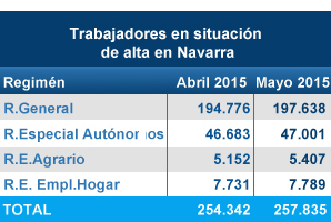 Según el último informe mensual de la Tesorería General de la Seguridad Social, Dirección Provincial Navarra, el pasado mes de mayo se contabilizaron 33.733 altas frente a 30.002 bajas en Navarra. De esta forma el mes se cerró con un saldo positivo de 3.493 personas afiliadas más a la Seguridad Social respecto al mes anterior, situando la cifra total en 257.835. Si comparamos los datos con el mes de mayo de 2014, son 7.101 afiliados más a la Seguridad Social que en ese periodo. Si observamos la serie histórica de los últimos años, ha sido el mejor mes de mayo desde 2011, confirmando una tendencia ascendiente en el crecimiento de trabajadores en alta.