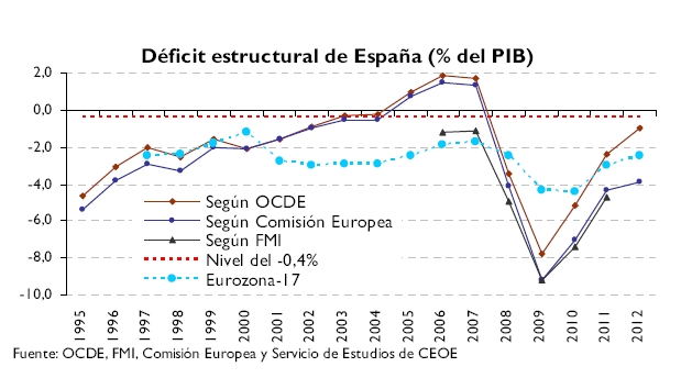 En la última actualización del Programa de Estabilidad para 2011-2014 se prevé que el déficit de la Administraciones Centrales se sitúe en este año en el menos 2,5 por ciento del PIB y el del conjunto de las Administraciones Públicas sea del menos 6 por ciento del PIB. Sin embargo, según aclara la patronal, la consecución de esos objetivos se hace cada día más complicada puesto que no se están dando los fundamentos que podrían inducir a una mejora de las cuentas públicas.