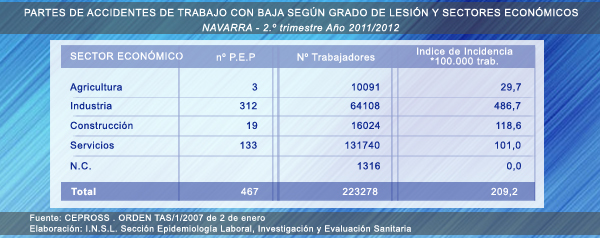 Durante el período de abril a junio de 2011 se han producido un total de 2284 accidentes de trabajo con baja, según datos facilitados por el Instituto Navarro de Salud Laboral correspondientes al segundo trimestre del año 2011. Respecto al mismo período del año anterior, se observa un descenso del número de los producidos en "Jornada de Trabajo" (2077 frente a 2255) y un ligero aumento del número de los "in itinere" (207 frente a 194). El descenso de los primeros se produce en todos los sectores y, respecto al grado, se han registrado mayor número en graves (17 frente a 16) y 2 mortales este año, frente a uno en el mismo período del año pasado.