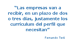 Otras de las ventajas que ofrece este servicio son la “gratuidad”, así como la interacción inmediata a través de internet, según destaca uno de los responsables de la agencia, Fernando Teré, aunque éste destacó, sobre todo, la posibilidad de ajustar la selección de candidatos a las necesidades de la empresa y la propia celeridad del proceso: “con el pequeño rato que las empresas nos dediquen al principio, de ajustar las características de la oferta, van a recibir, en un plazo de dos o tres días, justamente los currículum del perfil que necesitan”.