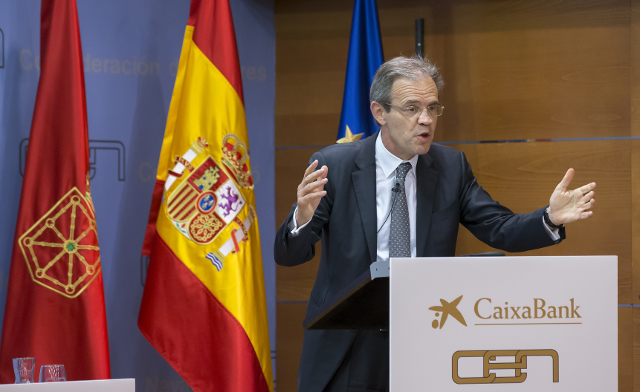 El presidente de CaixaBank, Jordi Gual, ofreció, el 20 de junio, en el auditorio de la sede de la Confederación de Empresarios de Navarra (CEN), una conferencia ante más de 100 empresarios navarros en la que analizó los retos a los que se enfrenta el sector empresarial en el contexto socioeconómico actual. Bajo el título "Perspectivas económicas y financieras", Gual destacó la responsabilidad de las empresas en un entorno en el que es necesario reforzar la confianza en el sistema económico y político. Durante la ponencia, le acompañó Ana Díez Fontana, directora territorial de CaixaBank en Navarra, y el presidente de CEN, José Antonio Sarría.