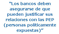 “Los bancos deben asegurarse de que pueden justificar sus relaciones con las PEP, teniendo en cuenta sobre todo la posibilidad de un cambio en su posición política en el futuro. Deben preguntar e investigar de dónde provienen los fondos de las PEP y deben estar preparadas para explicar el objetivo de las transacciones que llevan a cabo”, continúa Olcina.