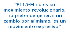 Innerarity subrayó el hecho de que el movimiento de los indignados, el llamado 15-M, ha sido un catalizador, y ha puesto sobre la mesa temas poco atendidos, como son las contradicciones del propio sistema político. Este movimiento no posee un programa político, por lo que a la hora de traducirlo en medidas, reformas y procesos, habrá discrepancias, pero no por eso pierde legitimidad. "El 15-M no es un movimiento revolucionario, no pretende generar un cambio por sí mismo, es un movimiento expresivo", es decir, envía un mensaje que hay que saber escuchar y traducir a la política.