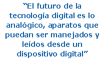 Con respecto a las oportunidades de negocio relacionadas con la tecnología, Alfons Cornella, realizó una afirmación sorprendente y es que “el futuro de la tecnología digital es lo analógico”. En este sentido, explicó que existe una oportunidad de desarrollar todo tipo de aparatos especializados, pensados para realizar una acción concreta y ser manejados y leídos desde un sistema digital, como un teléfono inteligente.
