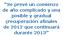 Así, aunque matiza que el nivel de incertidumbre es muy elevado, prevé un comienzo de año complicado y una gradual recuperación que continuará durante 2013. En este sentido, explica que el necesario cumplimiento del Pacto de Estabilidad erosiona la demanda interna en el corto plazo, pero que si se realiza con firmeza, al igual que las reformas estructurales, la ganancia de credibilidad en los mercados financieros internacionales, con la consecuente caída de la prima de riesgo y de los costes financieros, podrían contribuir a la mejora de la confianza en las empresas y familias. En consecuencia, se produciría una recuperación de la economía española a finales de 2012 que se consolidaría en 2013.