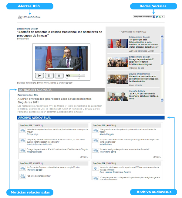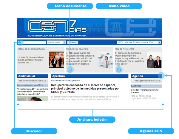 Entre las novedades del boletín se encuentra la sección archivo audiovisual donde el lector podrá consultar vídeos publicados en boletines anteriores sobre jornadas, cursos, seminarios y actos celebrados en la Confederación de Empresarios de Navarra. Así, los usuarios tendrán un rápido acceso a un gran fondo documental con toda la información relevante de la actualidad empresarial navarra.