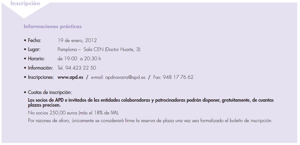 Los interesados pueden formalizar su inscripción en www.apd.es, en el email apdnavarra@apd.es o a través de un fax en el 948177662. Los socios de APD e invitados de las entidades colaboradores y patrocinadoras podrán disponer gratuitamente de cuantas plazas precisen teniendo prioridad de inscripción. Los no socios, por su parte, deberán abonar una cuota de 250 euros más el 18 por ciento de IVA.