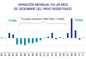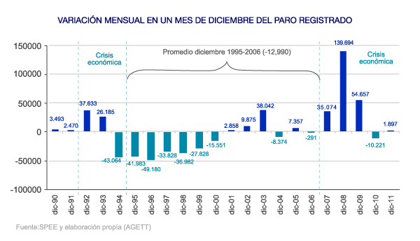 Así, enlos últimos años el desempleo se ha incrementado en una media de 44.220 parados en los meses de diciembre, mientras que en la anterior crisis correspondiente a los años 1992- 1994 el desempleo aumentaba una media de 6.918 parados en los meses de diciembre.