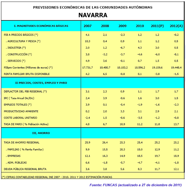 La Fundación de Cajas de Ahorros, FUNCAS, acaba de publicar sus previsiones para este año. Según esta entidad, el PIB a precios básicos de la Comunidad foral disminuirá dos décimas en 2012 respecto al año anterior. La previsión negativa contrasta con la emitida por el Gobierno de Navarra en el proyecto de Presupuestos Generales de Navarra 2012 donde se prevé para este año un crecimiento del PIB próximo al 2 por ciento.