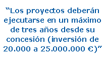 - Proyectos de inversión desde 20.000 euros hasta 25.000.000 de euros, a ejecutar en máximo de tres años desde concesión.