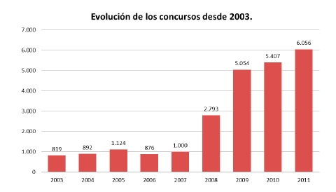 Al mismo tiempo, los concursos al cierre de 2011 superan por primera vez los 6.000, y aumentan un 12% respecto a 2010, si bien esta cifra es relativamente pequeña si la comparamos con los 60.000 concursos/año de Francia.