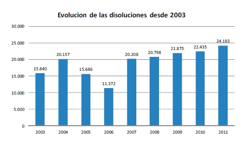 No obstante, al igual que en Navarra, en España también se disolvieron más compañías en el ejercicio 2011 que en el de 2010, concretamente 1.748 disoluciones más, lo que supone un crecimiento del 8%. En nuestra Comunidad hemos pasado de 250 disoluciones en 2010 a 333 en 2011. Si observamos la evolución de las disoluciones en España, no han parado de crecer desde 2007. En 2011 los motivos de disolución fueron los siguientes: un 70% de voluntarias,  un 11,92% de tipo judicial y un 10,14% por reestructuración empresarial.