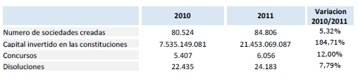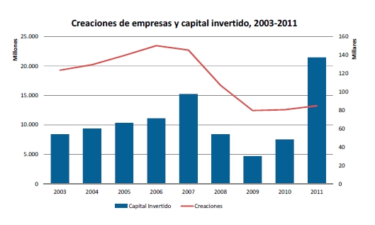 En cuanto al capital invertido para la creación de estas sociedades, el fuerte incremento respecto a 2010, un 185%, se debe a procesos de reestructuración empresarial y no tanto a nuevos proyectos empresariales. La explicación a estos datos se encuentra en varias constituciones “atípicas”: en marzo, la Sociedad Estatal Loterías Y Apuestas Del Estado (12.520.592.000 euros); en octubre, Ibercaja Banco S.A. (2.134.500.000 euros); y en diciembre, Banco de Caja España de Inversiones Salamanca y Soria S.A., 888.837.000 euros, y Unicaja Banco S.A., 800.000.000 euros. Sin contabilizarlas, la inversión acumulada estaría por debajo del mismo periodo del pasado año, un 32%.