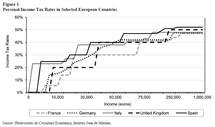 Es importante también considerar la estructura de tipos de impuesto de ingresos personales y comparar España con otros países europeos, como Francia, Alemania, Italia y el Reino Unido. Las tasas impositivas de ingresos personales en España estarán entre los más altos para cualquier nivel de ingresos en los países considerados.