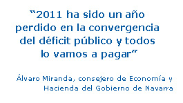 Miranda recordó que, según los objetivos de Bruselas, el año pasado tendríamos que haberlo cerrado con un déficit del 6%. Por lo tanto, consideró que “ha sido un fracaso colectivo del país”, y que “tendrá consecuencias”. En concreto, aseguró que “2011 ha sido un año perdido en la convergencia del déficit público y todos lo vamos a pagar”.