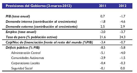 • En segundo lugar, porque urge acometer un ajuste presupuestario de calado en una economía de nuevo en recesión y, por ello, más debilitada. El Gobierno ha presentado un cuadro macroeconómico para 2012 realista, con una estimación de caída del PIB del 1,7%, muy en línea con las previsiones de CEOE (-1,6%) y del FMI y algo más alejadas de las anunciadas por la Comisión Europea (-1%). Esto significa que la economía española estará en recesión todo el año y que el desempleo seguirá aumentando y, por ello, la tasa de paro se situará en el 24,3%.
