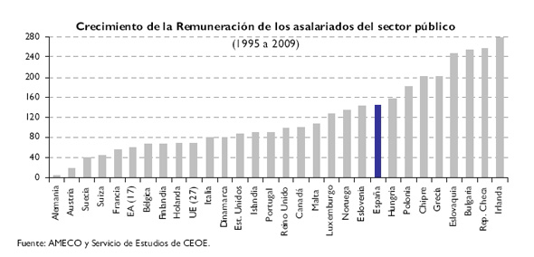 Una de las medidas que va a contribuir a ello, si bien parcialmente, es la limitación y el control de los sueldos, salarios y demás retribuciones en especie de los altos cargos del Sector Público Empresarial y de algunos organismos públicos, al igual que la reducción del número de consejeros. En el informe de CEOE titulado “Debate de la eficiencia del sector público: una contribución en el ámbito del número y coste del personal” de diciembre de 2011, se ponía de manifiesto que el exponencial aumento de la partida de gasto de personal del conjunto de las Administraciones Públicas se concentraba en aquellos organismos, entes o empresas públicas que no están sometidos al control de Ley de Presupuestos Generales del Estado.