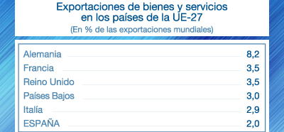 Según los últimos datos disponibles para el año 2010, Alemania es el principal exportador de la UE con una participación del 8,2% en el total de las exportaciones mundiales. Francia y el Reino Unido alcanzan ambos un 3,5% sobre el total, al tiempo que los Países Bajos registran un 3,0% e Italia un 2,9%.