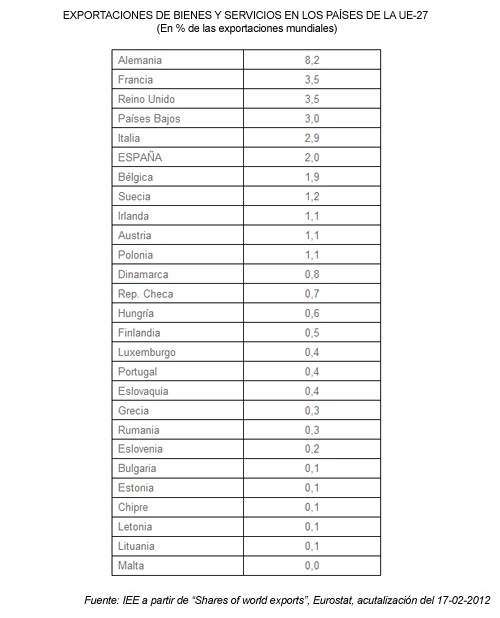 España ocupa el sexto lugar entre las naciones más exportadoras de la UE-27