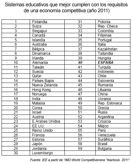 Según informa el Institute for Management Development (IMD) en su anuario sobre competitividad mundial 2011, el sistema educativo español no cumple con las exigencias necesarias para una economía competitiva.