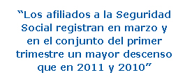 Los datos de afiliación a la Seguridad Social y paro registrado, correspondientes a marzo, cierran el primer trimestre de 2012 con una evolución muy desfavorable del mercado de trabajo, que supera la de finales de 2011. Los resultados de las estadísticas laborales en lo que va de 2012 vaticinan que la Encuesta de Población Activa (EPA), que se conocerá a finales de abril, mostrarán que el ajuste en empleo de la economía española se intensificó en el primer trimestre, con una caída de la ocupación y un nuevo aumento del paro, que puede superar los 5,5 millones de desempleados.