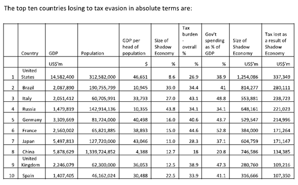 Estados Unidos: se calcula que hay 300.000 millones de dólares que escapan al control de Hacienda. En proporción al PIB suponen un el 8.6% de la economía estadounidense.