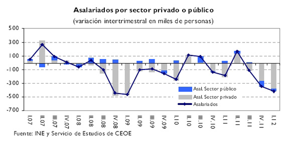 Como señala la Confederación Española de Organizaciones Empresariales, el ajuste del sector público será más intenso a partir del segundo trimestre, una vez que se empiecen a ejecutar los recortes contemplados en los Presupuestos Generales del Estado. Además, esta primavera se han agudizado las tensiones en los mercados financieros de deuda, lo que dificulta la recuperación del crédito. Por todo ello, CEOE mantiene sus previsiones, el PIB español caerá un el 1,6% en 2012.
