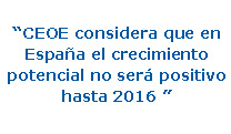 CEOE también considera que el crecimiento potencial no será positivo hasta 2016 y en el periodo 2016-2020 será en media del 1,2%, muy por debajo de la anterior etapa de expansión (alrededor del 2,7%). Por lo tanto, la economía española se enfrenta a un ciclo económico de recuperación lenta y prolongada en el tiempo, y menos intenso en crecimiento.