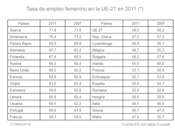 Según los últimos datos que acaba de facilitar Eurostat y de los que se hace eco el instituto de Estudios Económicos, la tasa de empleo femenino ha alcanzado un promedio del 58,5% en la UE-27 durante el año 2011. En la mayoría de países de la Unión, la tasa de empleo femenino ha caído desde el comienzo de la crisis, con la excepción, sobre todo, de Alemania y Austria que registran unas subidas notables.