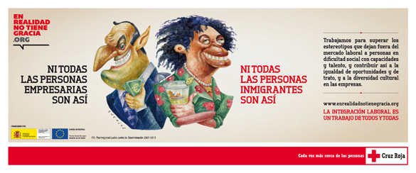 Cruz Roja ha puesto en marcha una nueva campaña de sensibilización "En realidad no tiene gracia", cofinanciada por la Dirección General de Integración de los Inmigrantes del Ministerio de Trabajo e Inmigración y el Fondo Social Europeo a través del Programa Operativo Lucha contra la Discriminación 2007 – 2013, y que tiene como objetivo promover la gestión de la diversidad cultural y la igualdad de trato a escala social y empresarial, mostrando la contribución de las personas inmigrantes y otros colectivos en dificultad social a nuestro desarrollo conjunto.