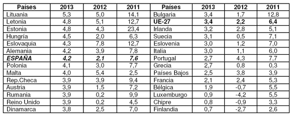 De nuevo serán los países de reciente adhesión a la UE los que lograrán un crecimiento mayor el año próximo. En cabeza estará Lituania con un 5,3%, figurando a continuación Letonia y Estonia, ambos con un 4,8%, así como Hungría (4,5%) y Eslovaquia (4,3%). Alemania compartirá con España una tasa de aumento de las exportaciones del 4,2% en 2013. Nuestro país logrará recuperar un crecimiento exportador más fuerte en el ejercicio 2013, ya que en 2012 se espera una tasa en torno al 2%. Polonia, Malta, la República Checa, Austria, Rumanía, el Reino Unido y Dinamarca se situarán alrededor o levemente por debajo del 4%, mientras que Bulgaria alcanzará un 3,4%, justo la media de la UE.